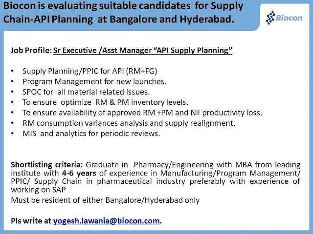 Biocon - Openings for Supply Planning API - Pharmacy / Engineering