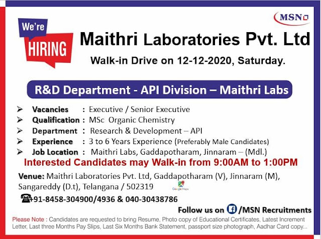 Maithri Laboratories Pvt. Ltd - Walk-In Drive for R&D Department -